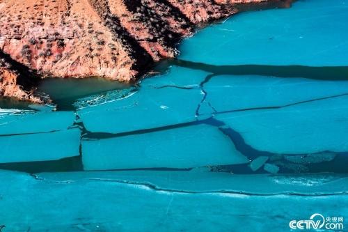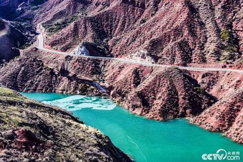 2024年4月5日,新疆昌吉,石门水库湖水湛蓝,与岸边高耸的丹霞地貌相映成趣。视觉中国
