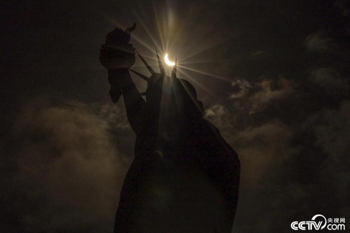 当地时间2024年4月8日,美国纽约,日食期间,月亮部分遮住了自由女神像后面的太阳。 视觉中国