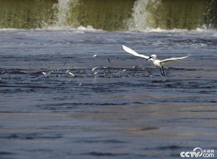 2024年4月9日,南京,秦淮河入江口,白鹭水面盘旋,捕食江中小鱼。视觉中国