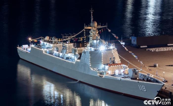 2024年4月22日,山东青岛,海军主题灯光秀点亮海滨,多艘海军舰艇对社会公众开放参观,庆祝中国人民解放军海军成立75周年。 视觉中国