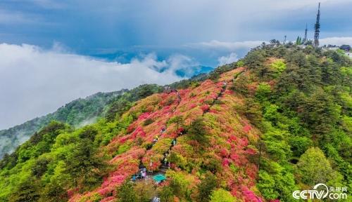 2024年4月28日,湖北麻城,龟峰山景区十万亩古杜鹃已进入盛花期,整个山峦被红地毯般的杜鹃花所覆盖,变为一片红色的海洋。视觉中国
