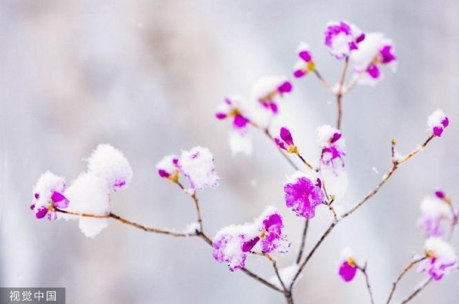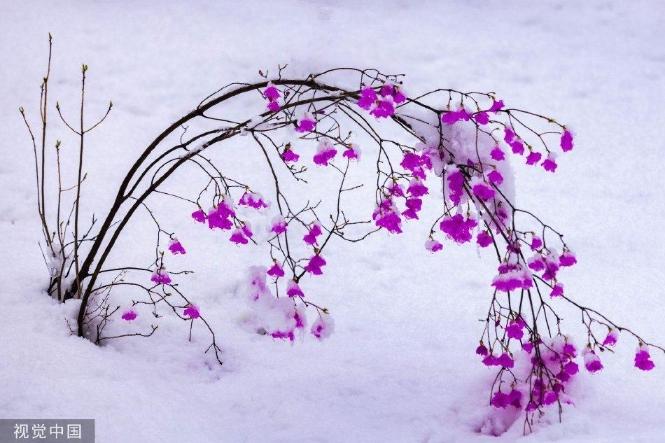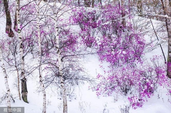 2024年4月29日,河北承德,围场满族蒙古族自治县连续两天降雪,漫山的映山红在雪中绽放。视觉中国