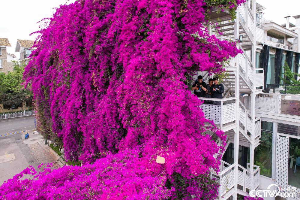 2024年5月9日,昆明街头的三角梅迎来盛花期,花朵顺着白色小楼倾泻而下如“鲜花瀑布”,吸引游客驻足观赏。视觉中国