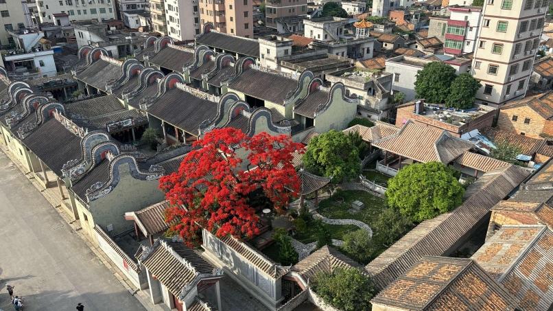 火红的凤凰花与青砖镬耳的岭南古祠交相辉映。何善福摄
