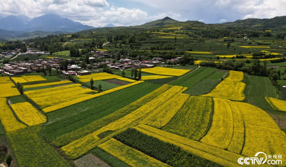 2024年6月14日,甘肃临夏,和政县15万亩油菜花进入盛花期。金灿灿的油菜花在蓝天白云的映衬下,与碧绿的田野、美丽的乡村交织成一幅幅色彩斑斓的田园画卷。 视觉中国