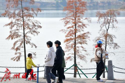 中新知识城环九龙湖的落羽杉近期成了一个热门打卡点,湖边的落羽杉悉数变色,趁着好天气,不少市民游客专门前来游玩拍照打卡。