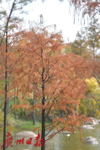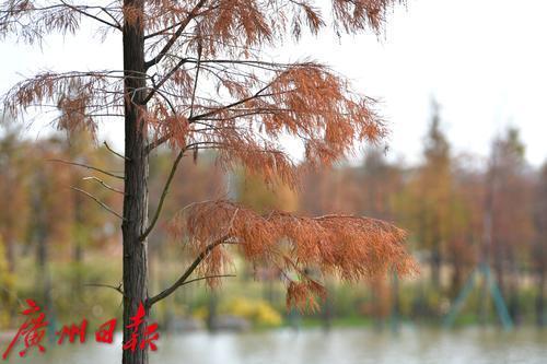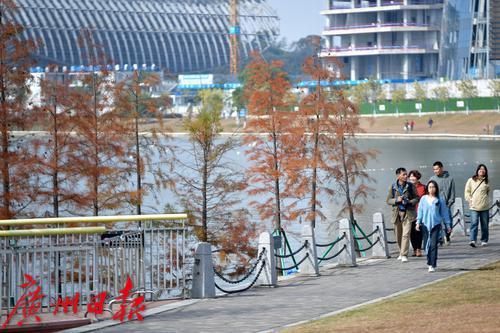 中新知识城环九龙湖的落羽杉近期成了一个热门打卡点,湖边的落羽杉悉数变色,趁着好天气,不少市民游客专门前来游玩拍照打卡。