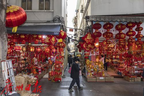 2025年1月7日,记者在广州市一德路街头看到,整条街都已成为红色的海洋,洋溢着浓厚的节日气氛。来自四面八方的采购人员络绎不绝,穿梭于各个档口之间。其中不乏俊男美女前来拍照打卡,定格冬日年味十足的瞬间。