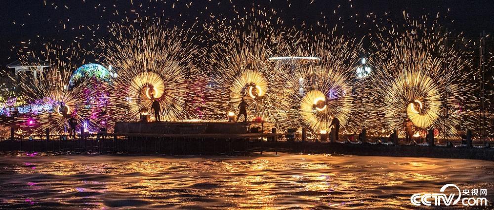 2025年2月4日,民间艺人在山西省运城盐湖景区为游客表演非遗项目打铁花。视觉中国