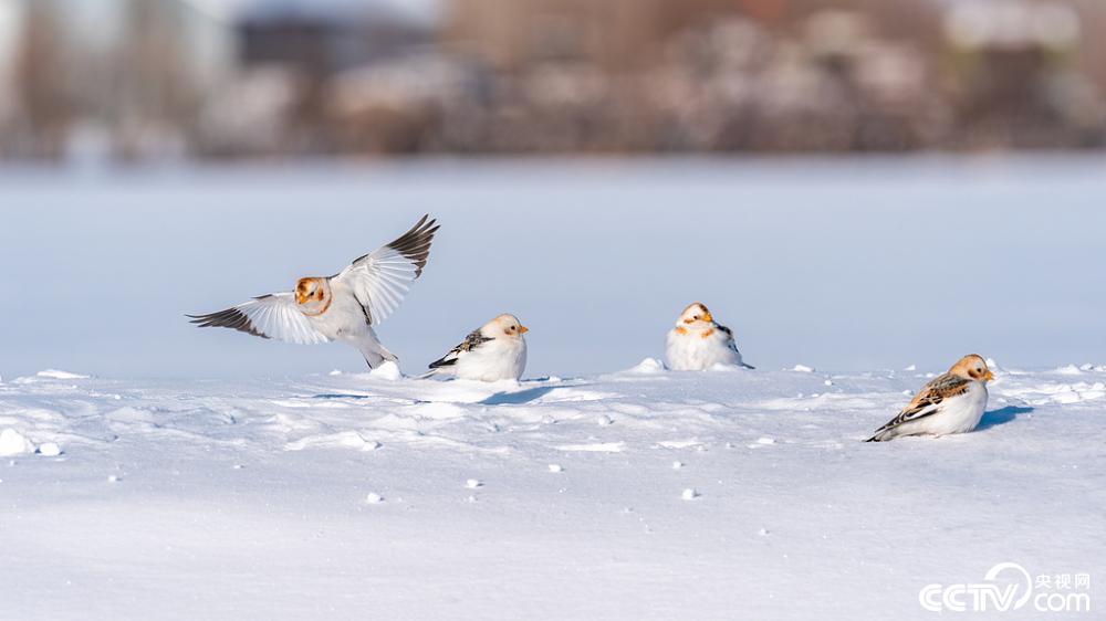 2025年2月1日,内蒙古呼伦贝尔,牙克石市乌尔旗汗镇,大兴安岭银装素裹,国家二级保护动物雪鹀在零下38摄氏度冰雪地上跳跃、打斗、嬉戏,为寒冷的冬季增添了生机与活力。视觉中国