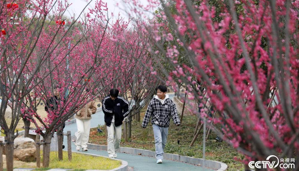 2月8日,江西省吉安市永丰县恩江湿地公园的红梅迎春绽放,人们纷纷前来赏花游玩,乐享早春美景。视觉中国