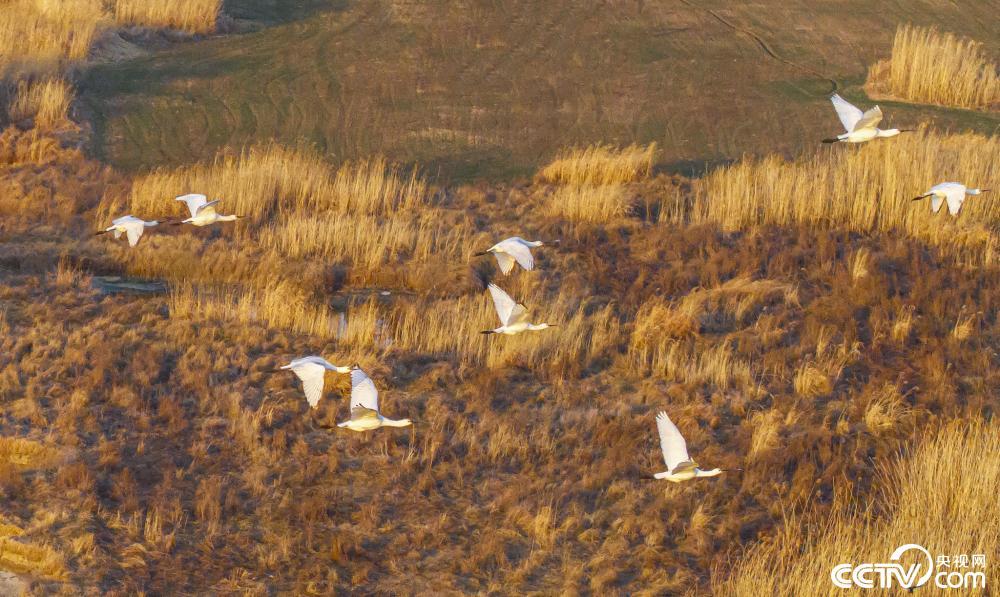 江苏宿迁:白琵鹭翩然飞跃芦苇荡
