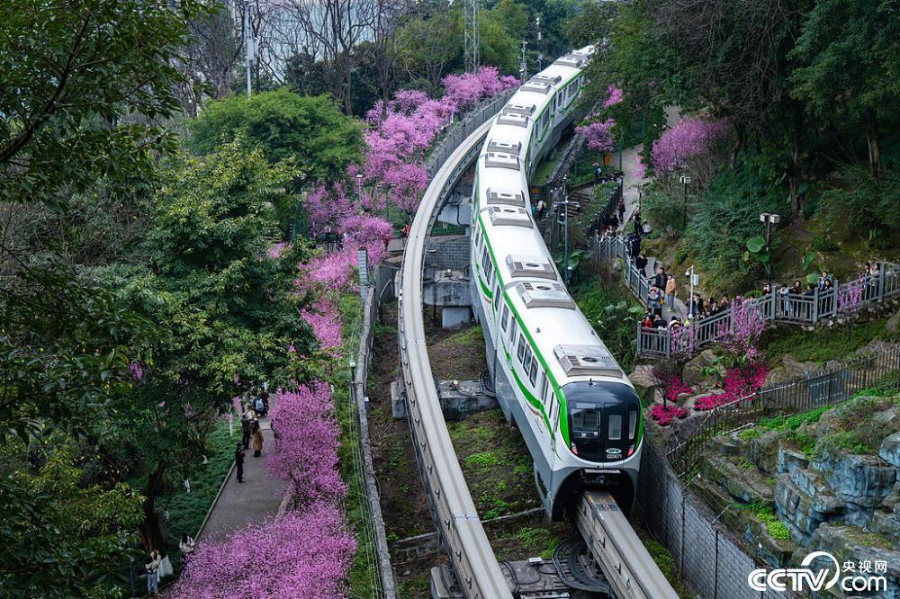 2025年2月22日,重庆,轨道2号线穿越佛图关公园美人梅粉色花海,彷如“开往春天列车”,吸引大量市民和游客前往参观和拍照。(视觉中国)
