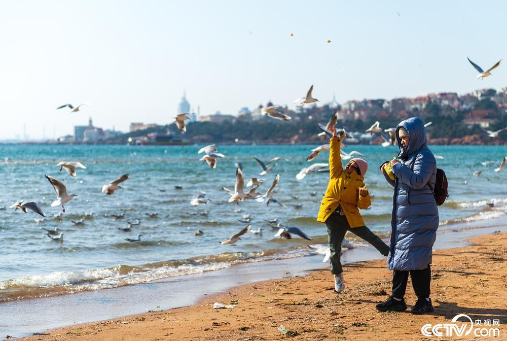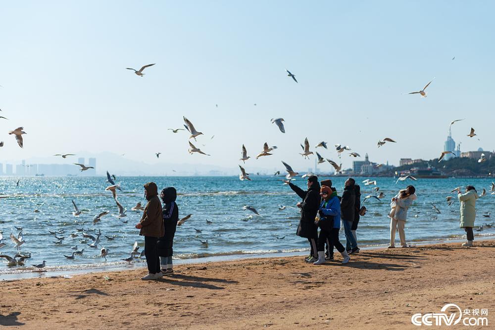2025年2月23日,青岛市,海滨海鸥翔集,游客在海边观赏、投喂海鸥。视觉中国