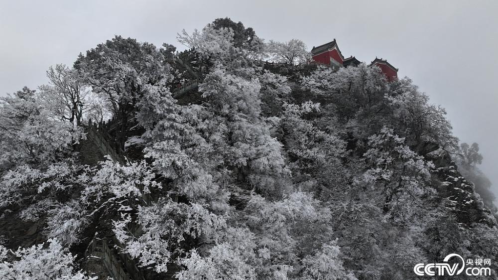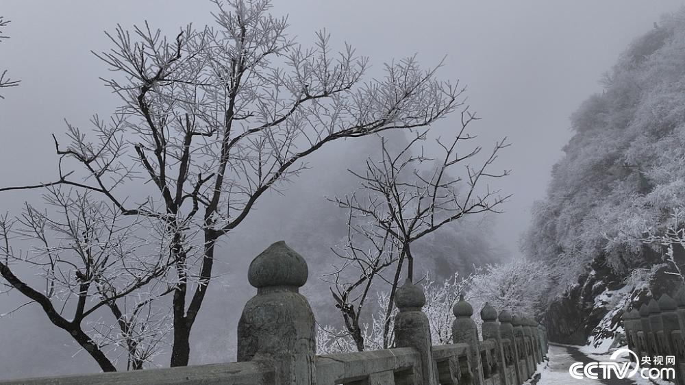 2025年2月23日,湖北十堰武当山金顶景区出现雾凇景观。由于大范围降温降雨,草木生出“玉树琼花”,金顶上银装素裹,仿佛冰雪世界。视觉中国