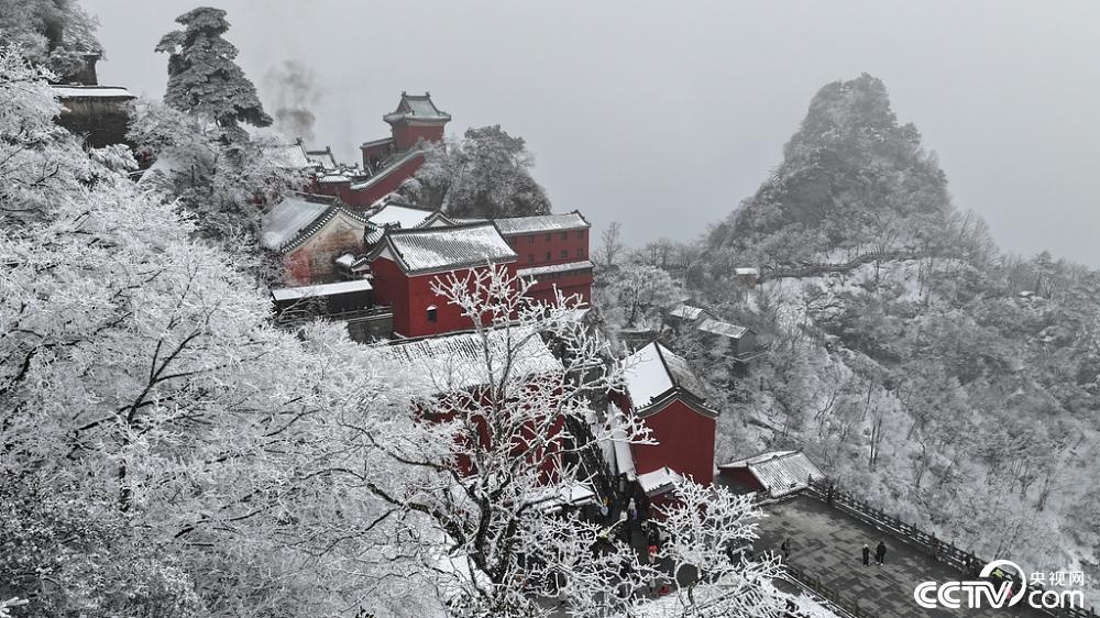 湖北十堰:武当山金顶现雾凇景观 古建换新装红白相映