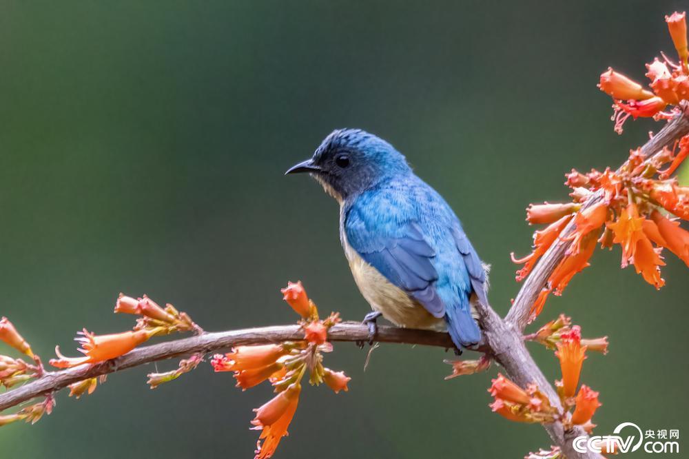 广东深圳仙湖植物园,虾子花盛开,引来鸟儿觅食,图中为蓝仙鹟。视觉中国
