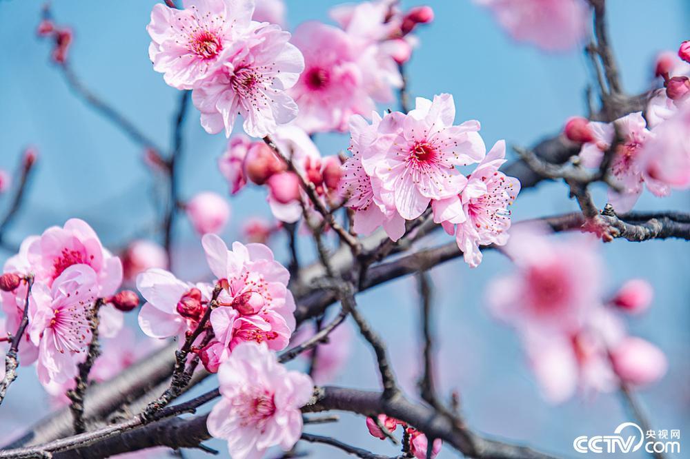 2025年2月24日,江西赣州,章贡区金凤梅园,美人梅盛开,娇嫩花朵在风中轻舞,增添春日浪漫气息。视觉中国