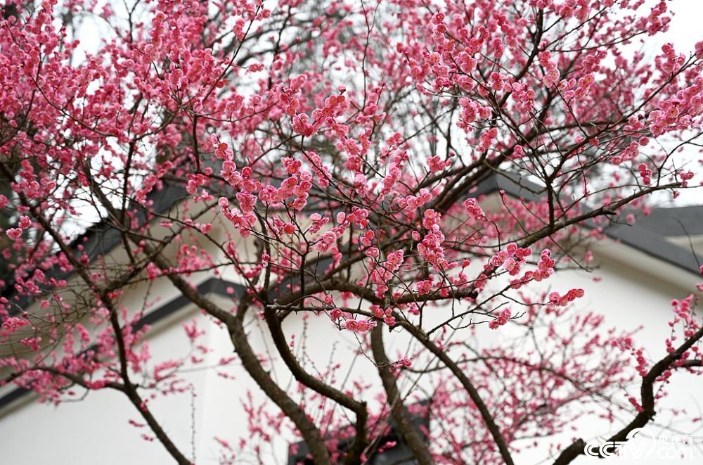 2025年2月25日,浙江省金华市武义县梅郎山公园的梅花竞相绽放,娇艳的梅花映衬着青砖黛瓦的白墙,构成了一幅美妙的春色图案。视觉中国