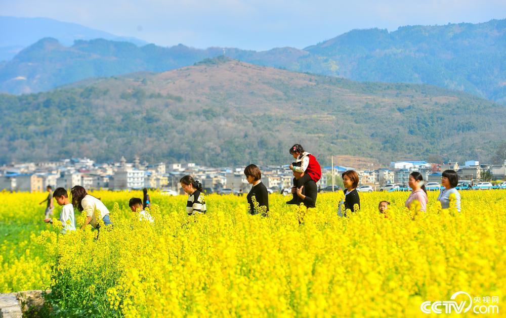 2025年3月1日,贵州黔东南苗族侗族自治州从江县洛香镇上皮林村,游人在油菜花海中拍照游玩。视觉中国