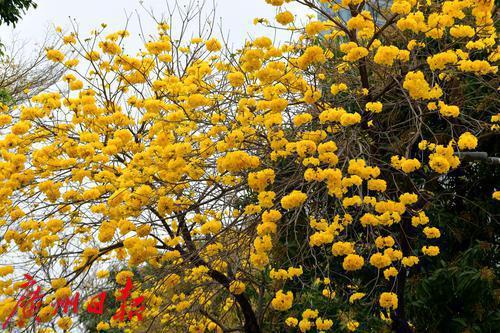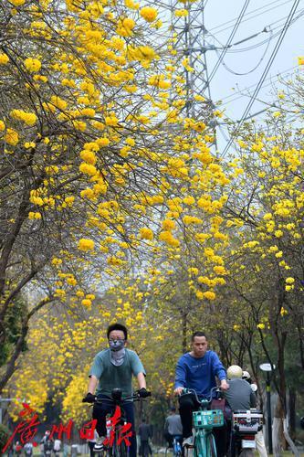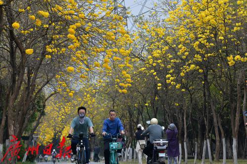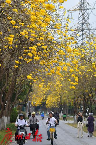 广州临江大道是一条景观大道,沿着临江大道行走,沿路似锦的繁花让人心醉,宫粉紫荆、木棉花、簕杜鹃等正值盛花期。其中尤以黄花风铃木更为娇艳,绿道两侧盛开的黄风花铃木让人误以为进入了童话的世界,吸引了不少市民游客流连观赏。