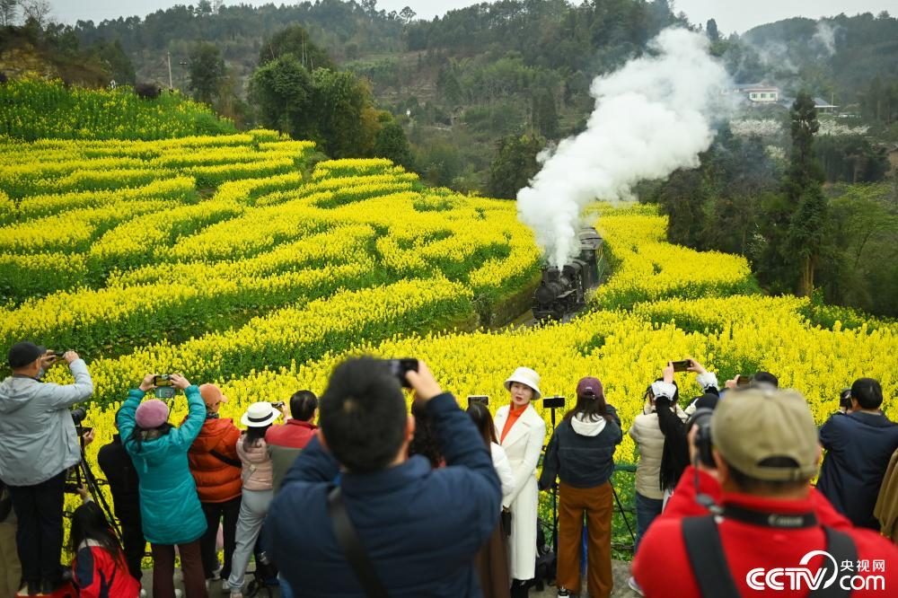 3月12日,四川乐山犍为县,蒸汽小火车穿过油菜花海。