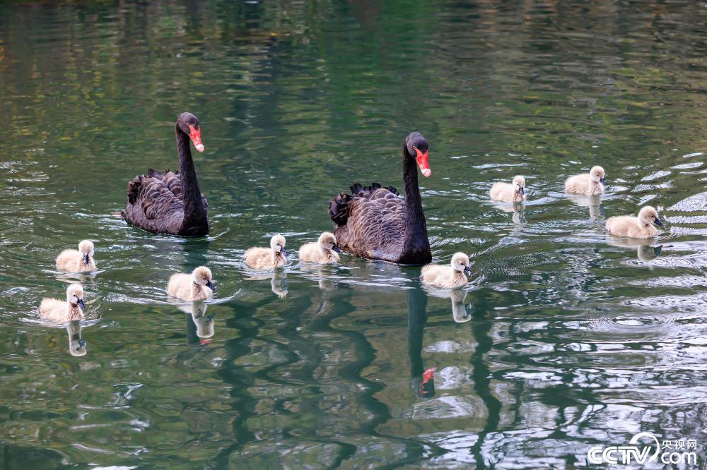2025年3月13日,云南昆明动物园,黑天鹅一家增加了九个小宝宝,黑天鹅妈妈负责看护,黑天鹅爸爸负责保护,一家很幸福。视觉中国