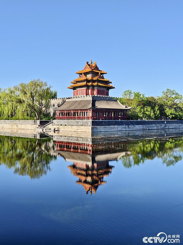 2025年4月22日,北京,春日雨后早晨阳光下的故宫角楼,蓝天下角楼倒影如镜。视觉中国