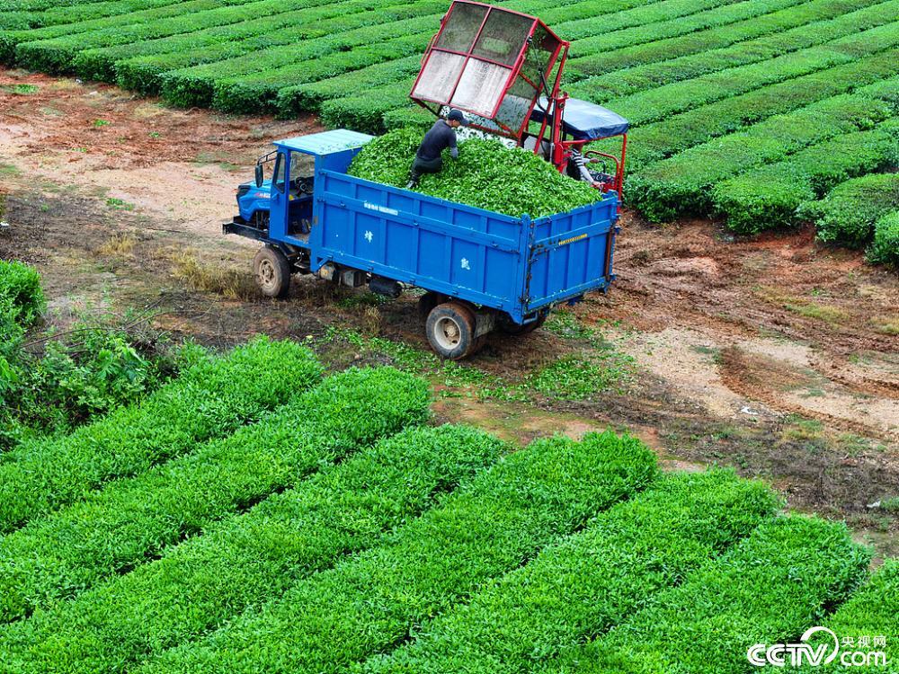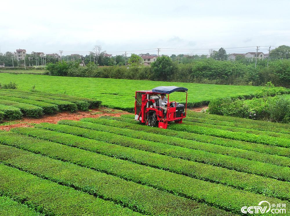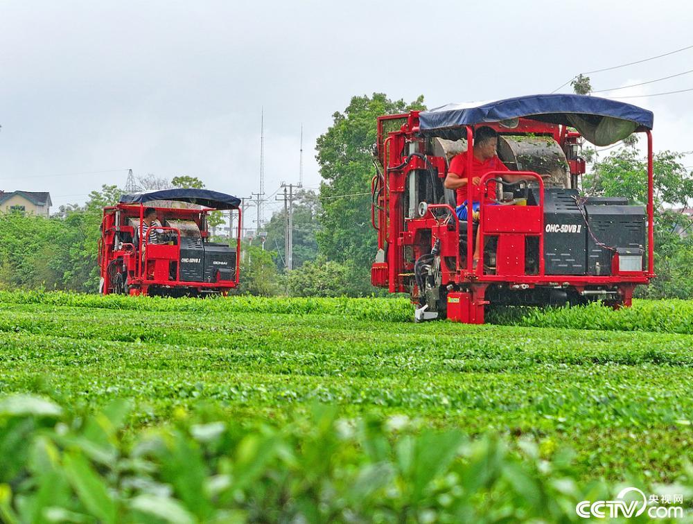 2025年4月22日,江西省吉安市泰和县泰和垦殖场茶园,工人驾驶采茶机正在采收茶叶。视觉中国