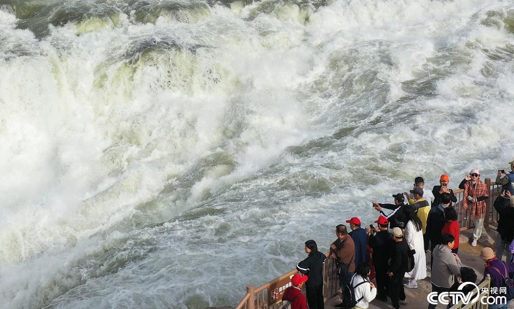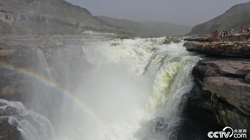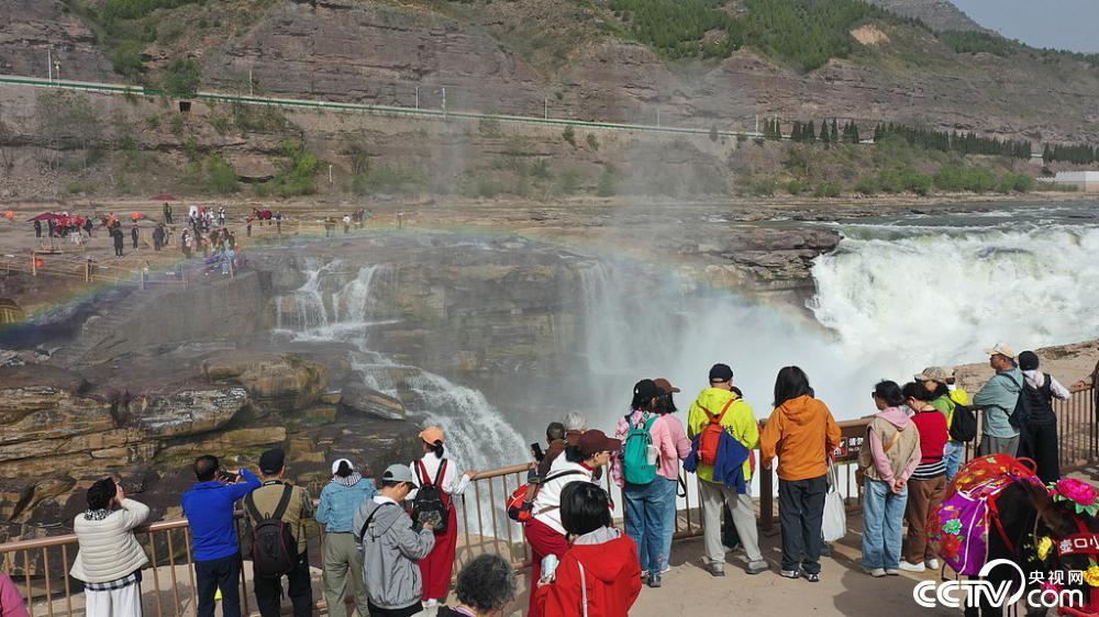 2025年4月22日,山西吉县,游客在黄河壶口瀑布欣赏“清流飞瀑”的别样景观。视觉中国
