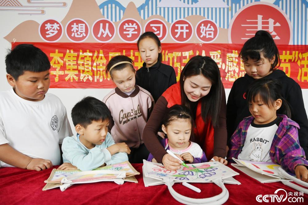 5月11日,江苏省徐州市睢宁县李集镇徐厂村新时代文明实践站,孩子们在志愿者辅导下用彩笔认真绘制送给妈妈的手提包。当日,各地组织多彩活动庆祝母亲节。视觉中国
