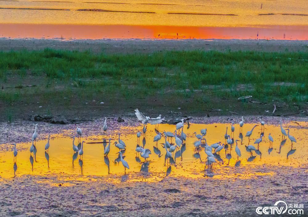江苏泗洪:洪泽湖湿地水位下降 霞光映照白鹭翩翩飞舞