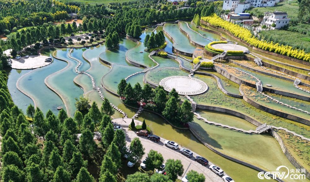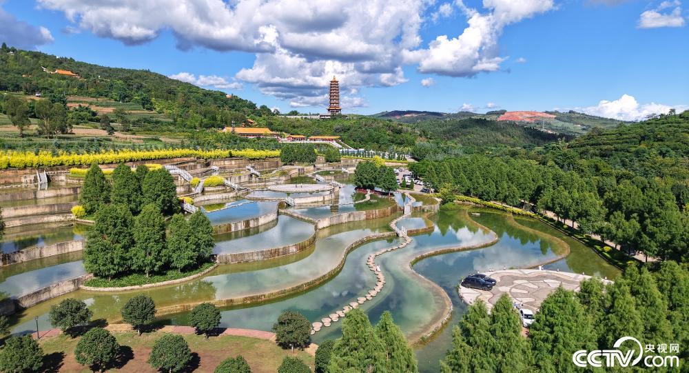 2025年8月17日,位于云南省红河哈尼族彝族自治州弥勒市锦屏山风景区脚下的五彩云池,碧水蓝天,倒影林立,五彩云池美如画卷,吸引游人观光游览。视觉中国