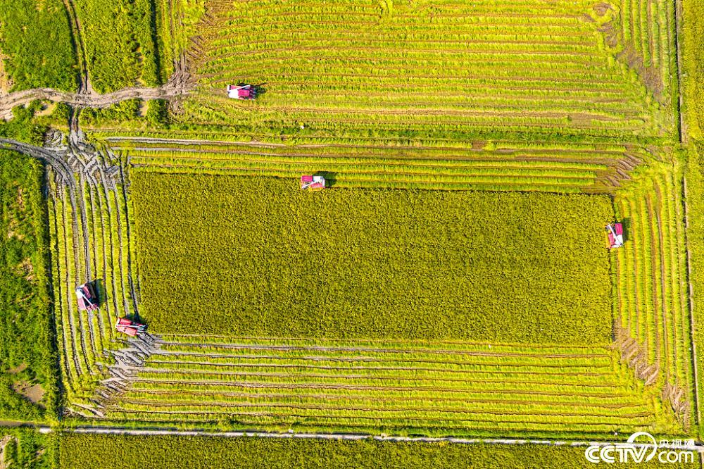 2025年8月19日,四川省眉山市东坡区太和镇水稻迎来丰收。金黄的稻田里,多台联合收割机轰鸣作业,高效推进收割进程,田间地头洋溢着丰收的喜悦。视觉中国