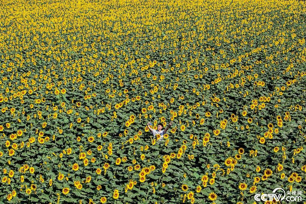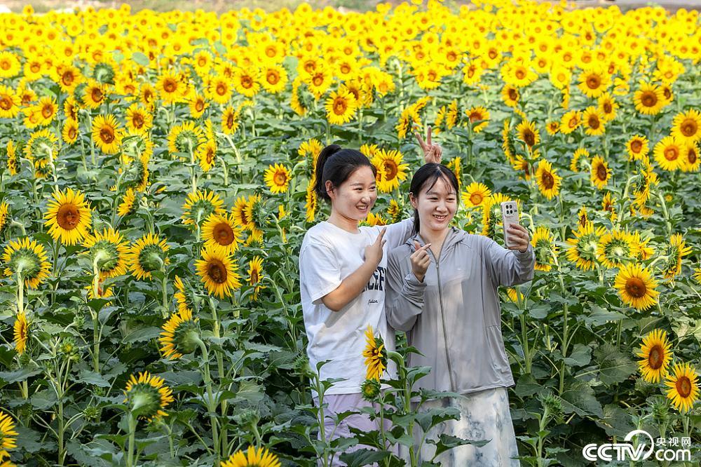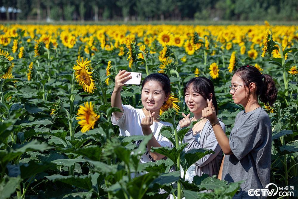 2025年8月18日,在河南省焦作市博爱县鸿昌街道马营村,市民们在赏花、拍照打卡。连日来,马营村的80亩向日葵基地繁花盛放,引市民游客纷至沓来。视觉中国