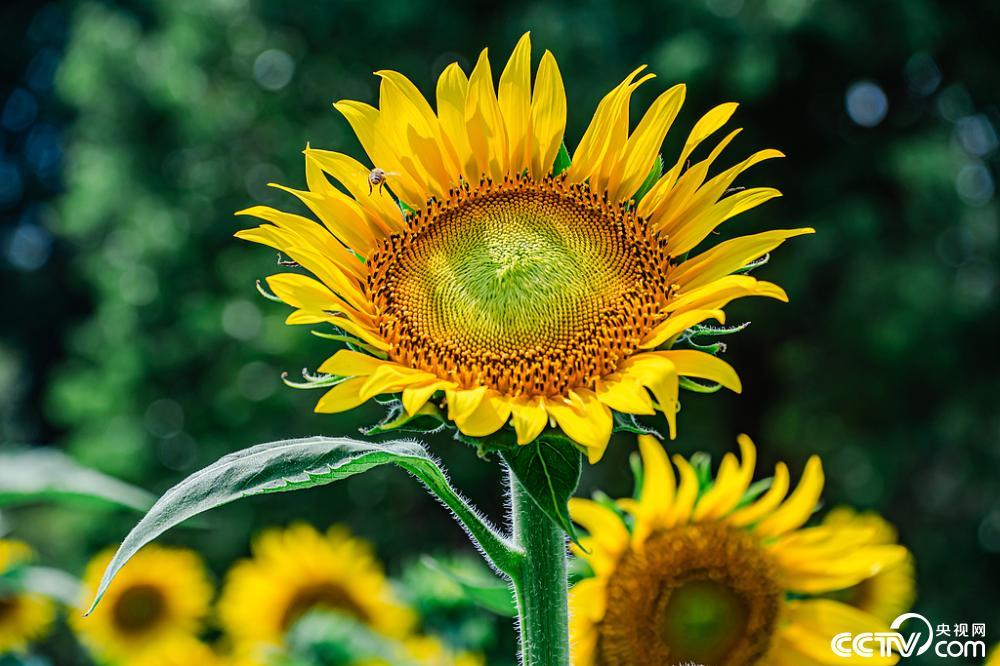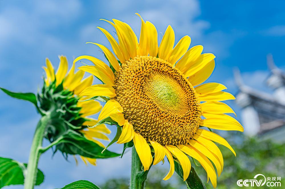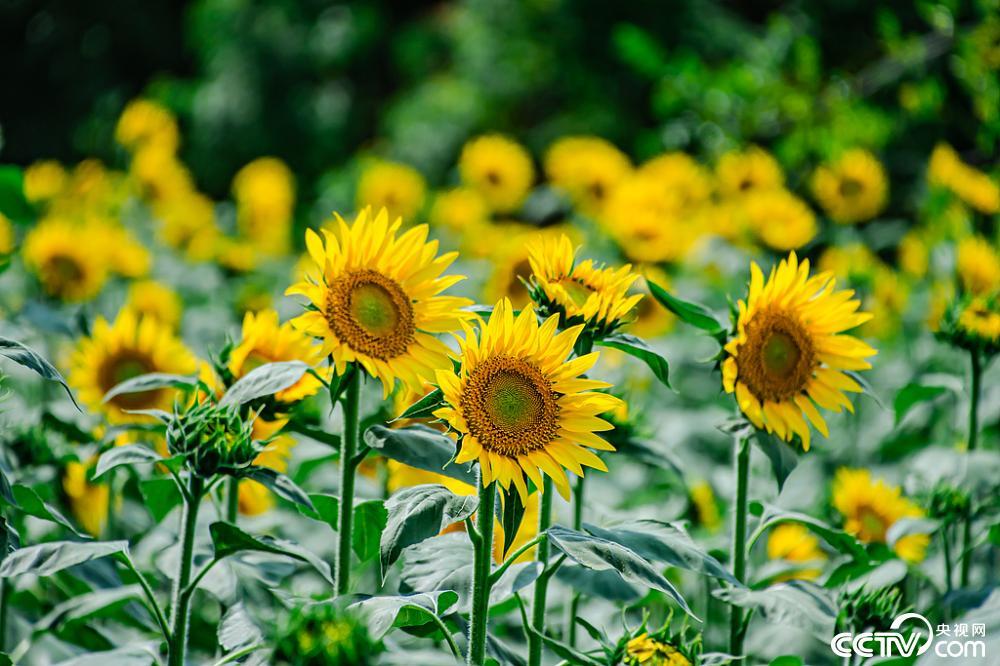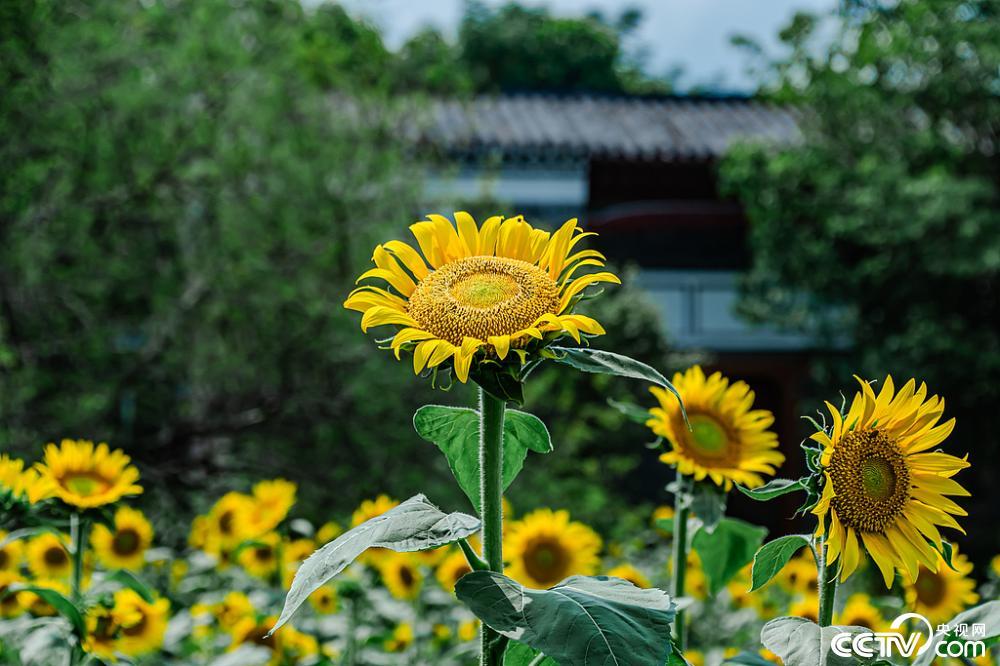 2025年9月4日,江西赣州,赣县区湖江镇夏浒古村向日葵花开,犹如金色海洋,绿叶黄花绚烂绽放,随微风摇摆,与青砖灰瓦的古村构成一幅美丽的秋日画卷。视觉中国