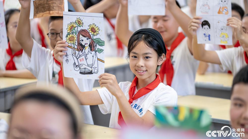 9月9日,眉山市彭山区第三中学开展“我心中的老师”绘画活动,学生展示自己的绘画作品表达对老师的感谢和祝福。