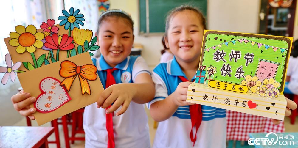 9月9日,山东省临沂市郯城县郯城街道官塘幼儿园的孩子将在老师的指导帮助下制作的绘画送给老师。