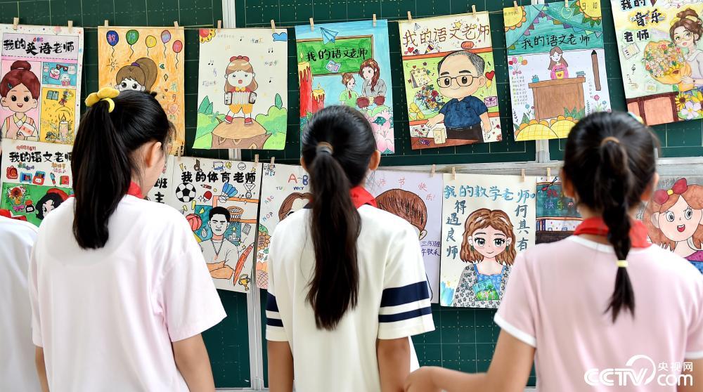 9月9日,安徽合肥,学生观看“心中的最美老师”绘画作品展。