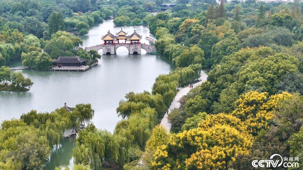 2025年9月11日,初秋的扬州瘦西湖风景区,夏日的翠绿尚未褪去,秋日的斑黄已悄然点缀其间,斑斓的色彩与五亭桥、白塔等古典建筑相映成趣,游客徜徉其间,宛若画中行。视觉中国