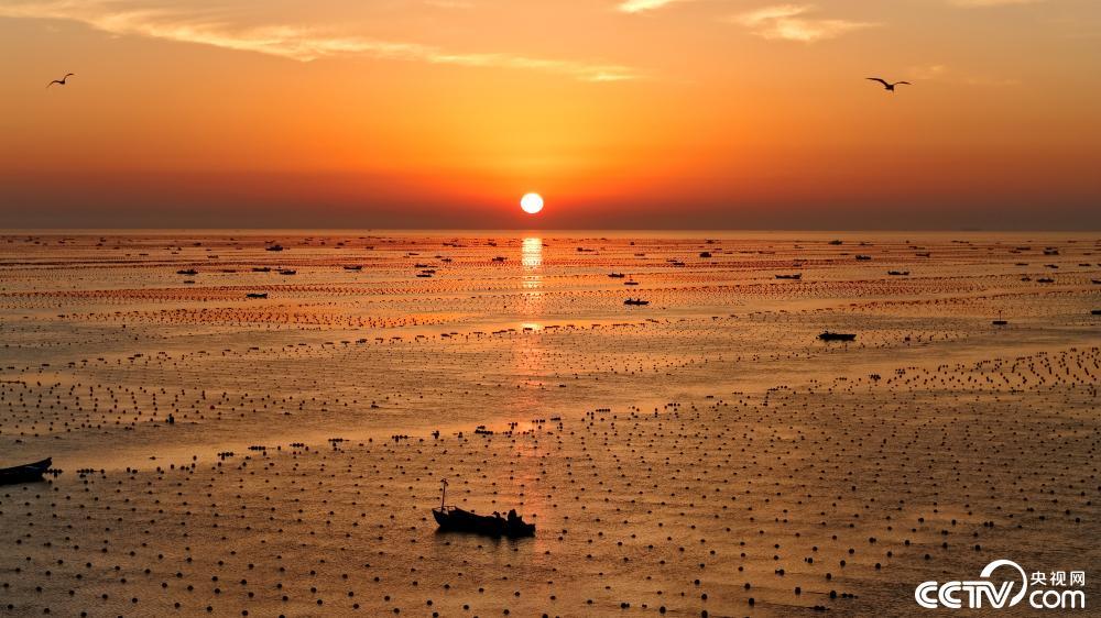 2025年9月11日,在山东荣成爱伦湾海洋牧场,海鸥飞舞,渔民们披着朝阳驾驶渔船从事海上秋耕生产。