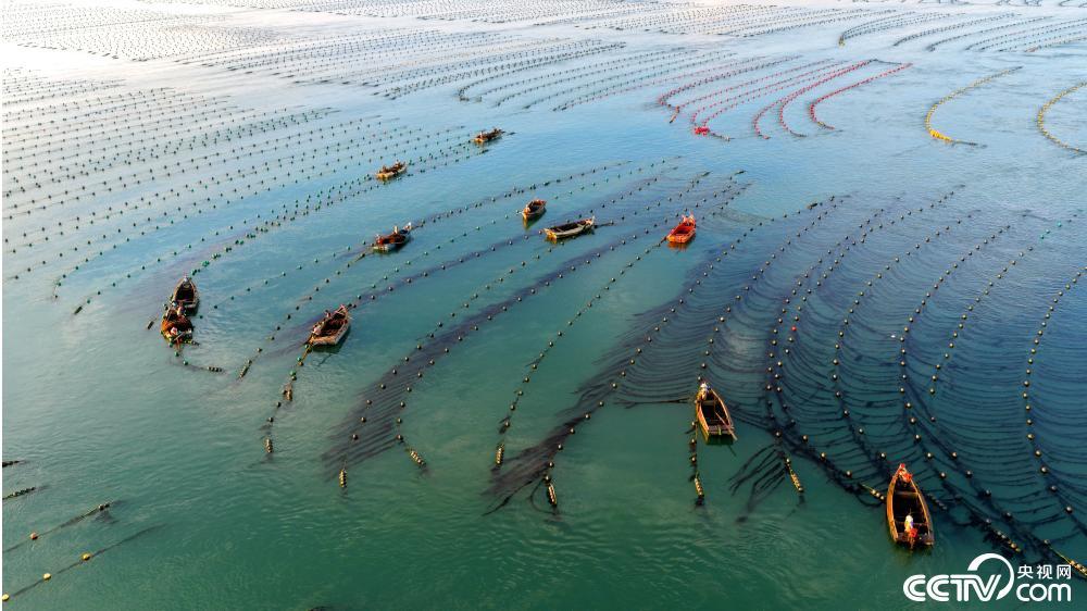 渔民们披着朝阳驾驶渔船收获江篱,喂养鲍鱼,整理养殖筏架等秋季各类海上生产,海上一派繁忙的劳动景象。
