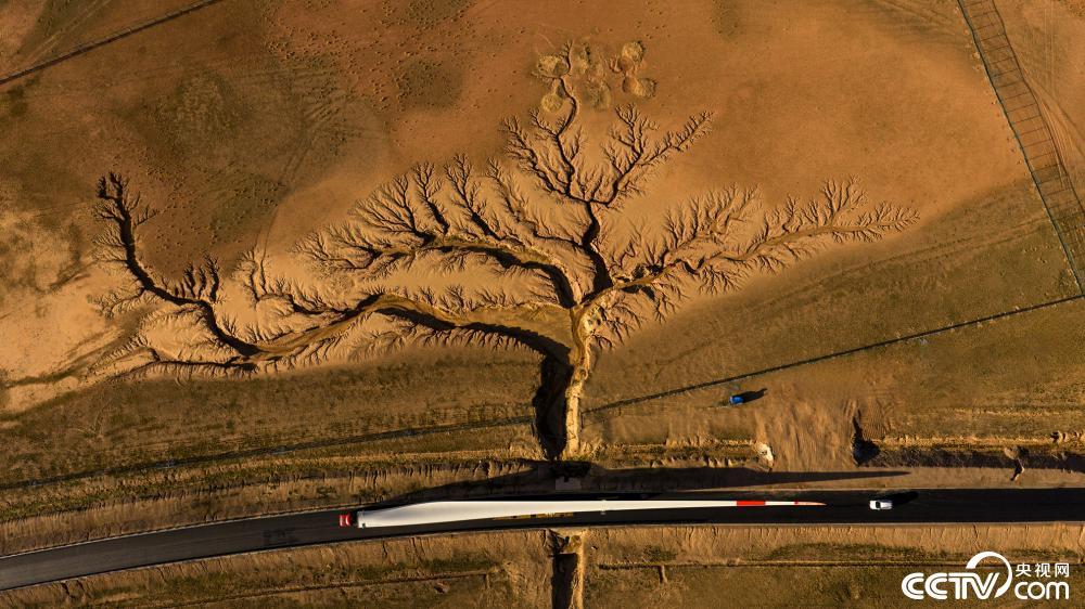 2025年9月18日,西藏那曲,317国道2442里程碑附近,由流水冲刷形成的“天空之树”与运输中的电力风车桨翼同框。 (视觉中国)