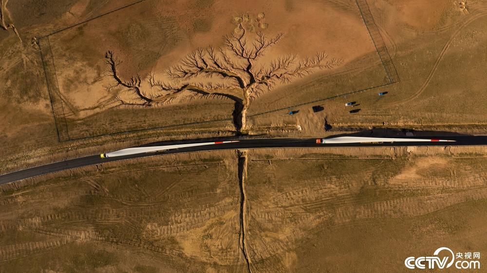 2025年9月18日,西藏那曲,317国道2442里程碑附近,由流水冲刷形成的“天空之树”与运输中的电力风车桨翼同框。 (视觉中国)