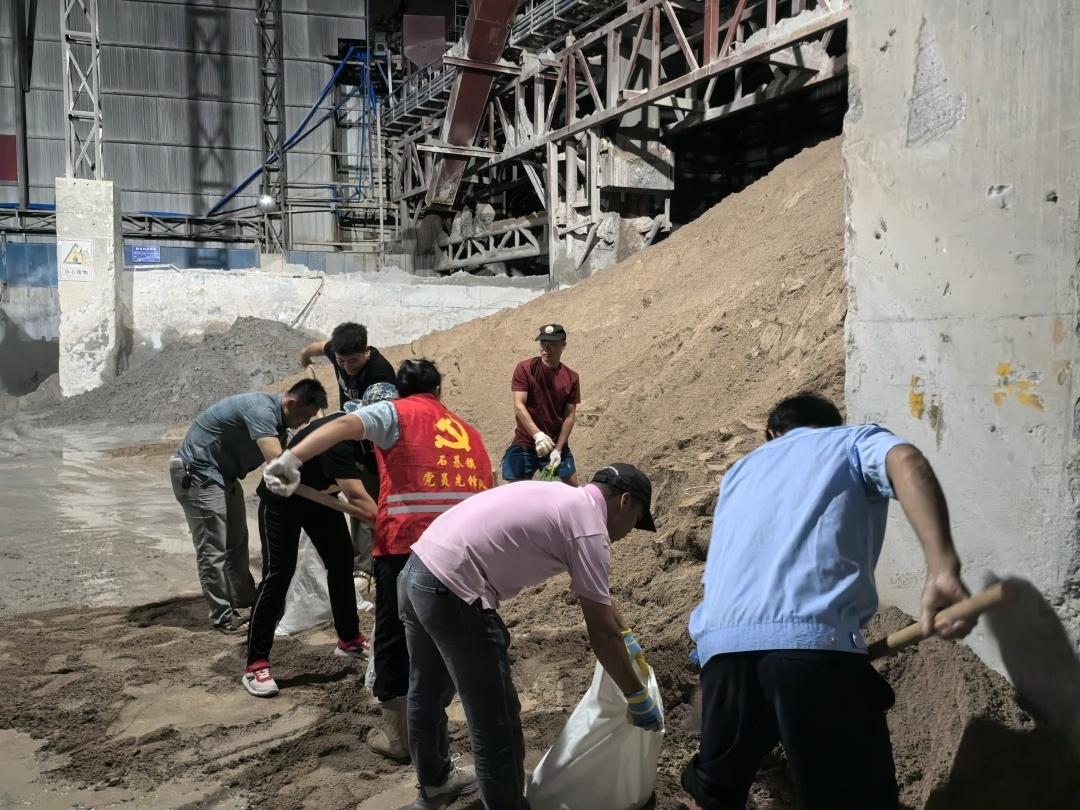 ▲石碁镇前锋村党员入夜仍然在准备沙包。