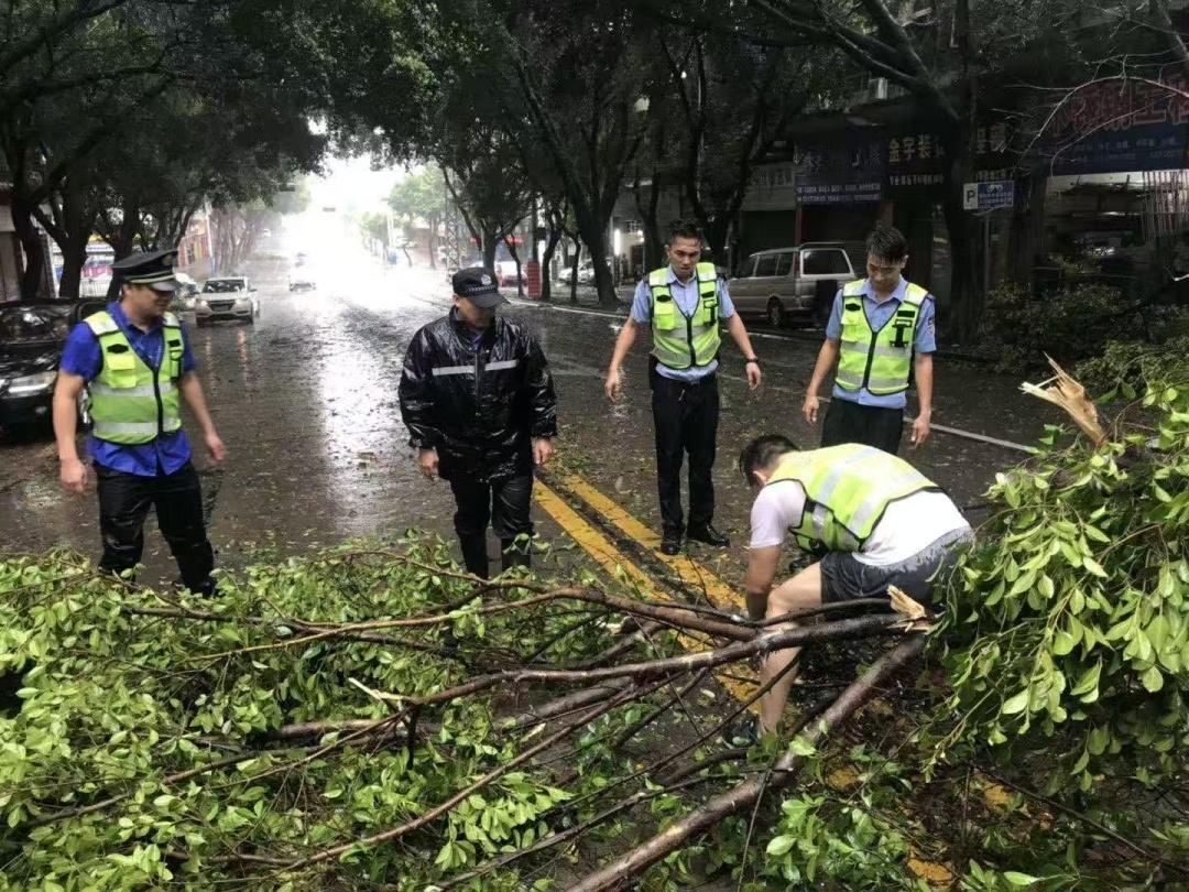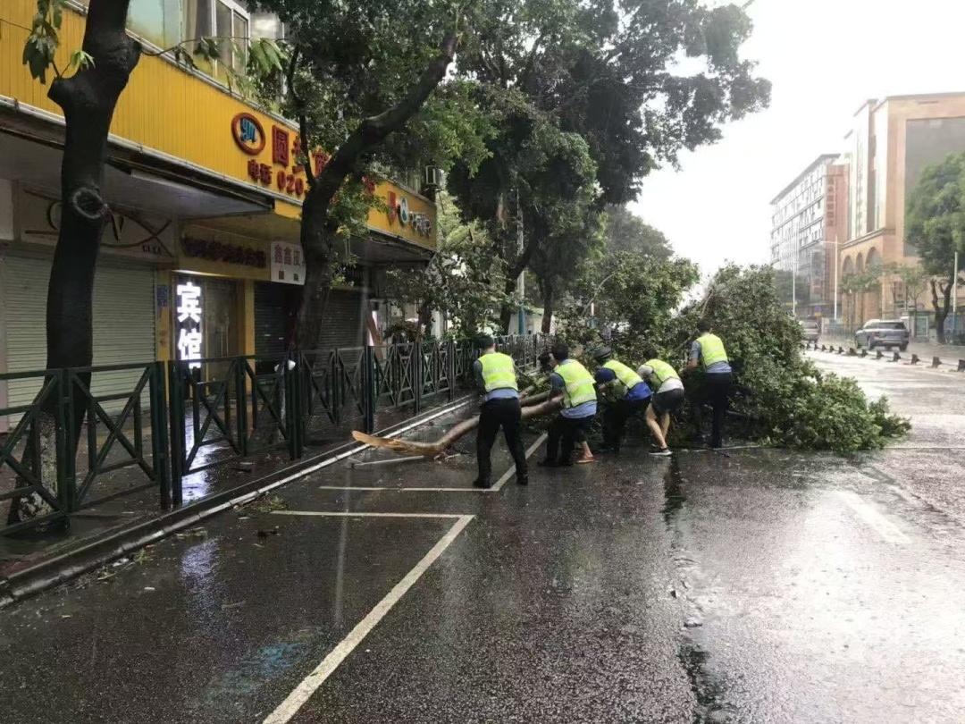 ▲受台风影响,市桥街多处出现倒树现象,市桥街红棉老兵志愿服务队队员主动联合属地居委会、执法队、环卫公司、驻村团队等到现场处理。