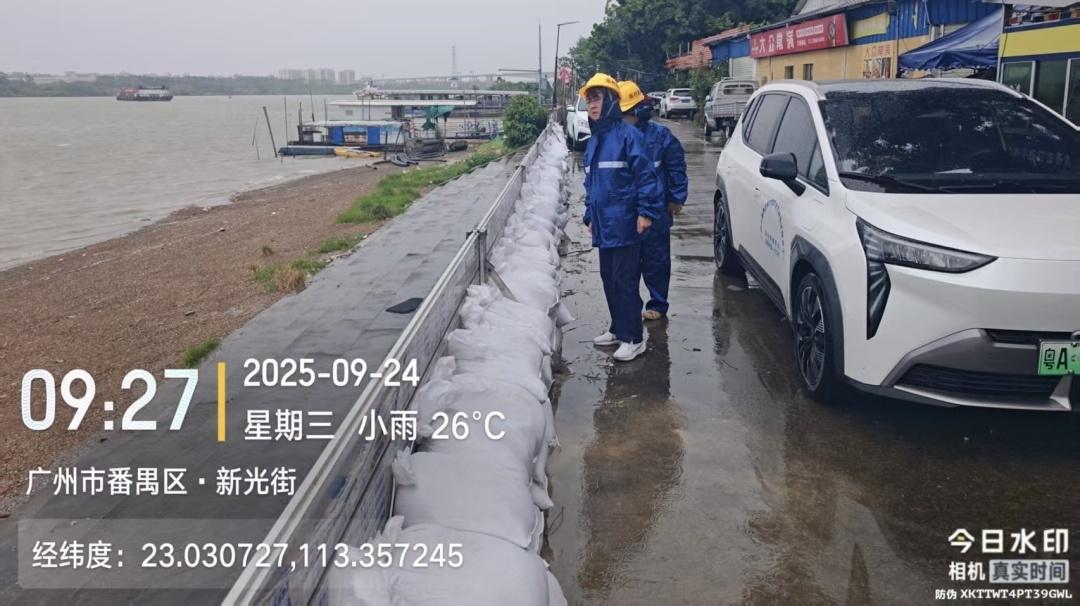 ▲9月24日上午,南村镇组织人员巡查外江大堤防风防潮情况。结合实际调度水利设施,对河涌进行预腾空,以降低水位。