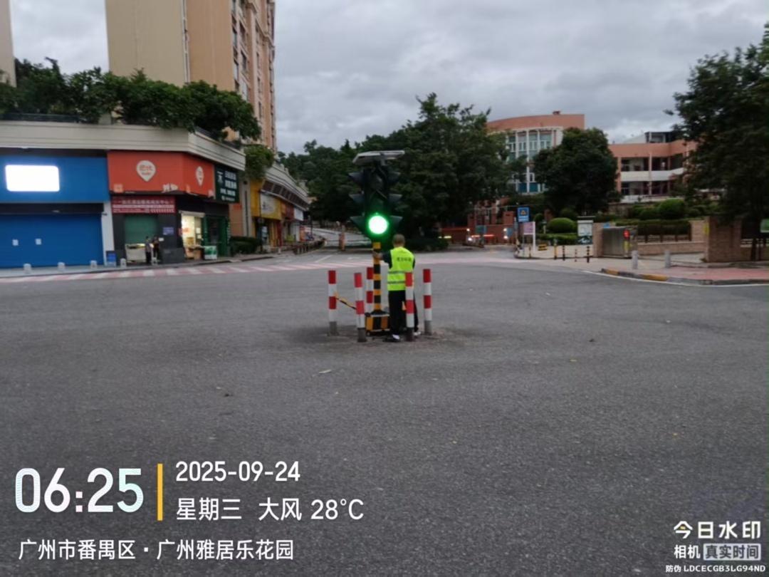 ▲9月24日上午,南村镇城市管理办派出应急队,扶正交通灯,清理台风吹落打断的绿化树。