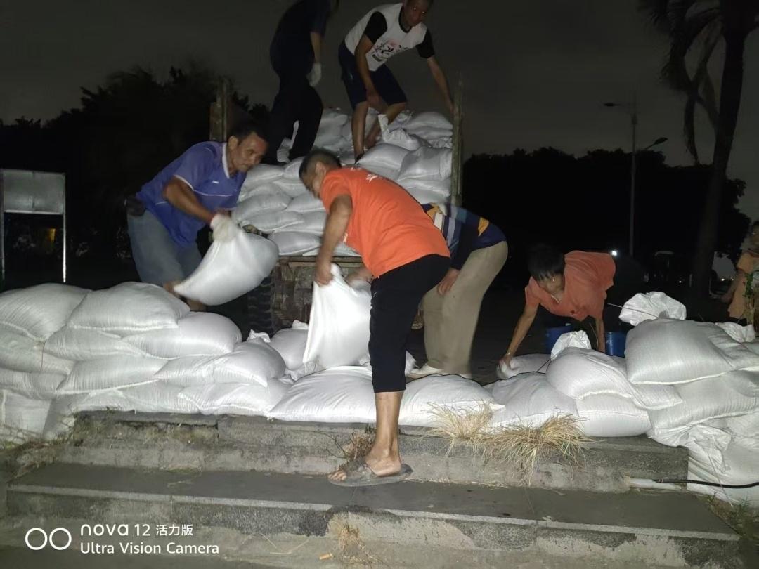 ▲石楼镇海心村工作人员加固堤围。