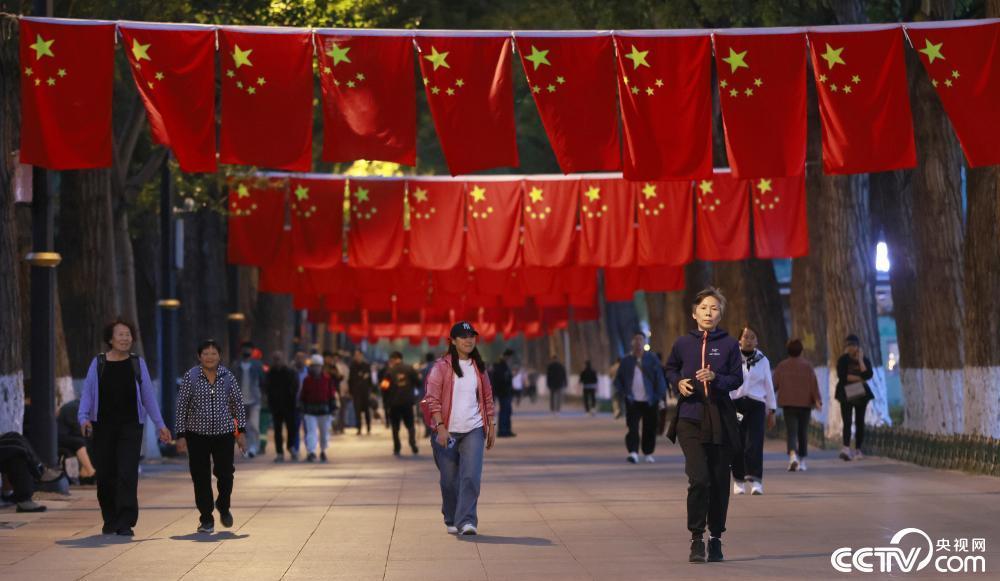 9月23日,黑龙江省哈尔滨市,国庆节临近,沿江公园挂起一面面国旗,喜庆氛围倍增。鲜艳的五星红旗,成为松花江畔一道靓丽的风景,吸引游客、市民驻足拍照打卡。视觉中国